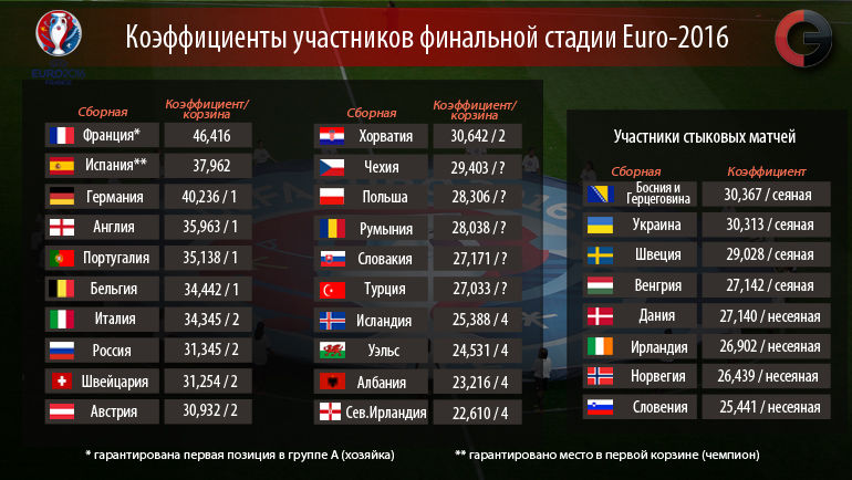 Что касается потенциальных групп жизни, то здесь многое будет зависеть от жребия из первой корзины. На мой взгляд, там есть два нормальных варианта и четыре плохих. Хуже всего, если достанется действующий чемпион мира Германия или чемпион Европы Испания (пусть провалившая ЧМ-2014, но по-прежнему мощная). Россия исторически плохо играет с этими командами, даже когда сама находится в хорошей форме – вспоминаем Euro-2008 и отбор на ЧМ-2010. Франция опасна, а статус хозяйки сделает ее еще сильнее. Встречи с ней хорошо бы избежать, равно как и противостояния с гениальным поколением бельгийцев, которые в ноябре возглавят рейтинг ФИФА.