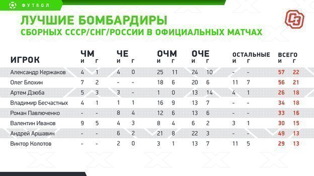 Каждому, кто забывает о вкладе Кержакова в наш футбол, надо показывать эту статистику. А то как-то упускается из вида, что Александр, недавно закончивший карьеру, был в таком порядке. И дело не только в «Зените» — там свои достижения. Кержаков — лучший бомбардир в истории сборной России/СССР. Когда у тебя в виртуальных конкурентах — Блохин и ты его обходишь по количеству голов, это дорогого стоит. Причем, среди команд, которым забивал Кержаков — Италия, Португалия, Уругвай. Есть чем гордиться.