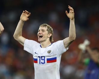 Форвард сборной России, который с тремя голами на данный момент делит второе место в споре снайперов Euro-2008, держал на ладони бронзовую медаль и не мог ею налюбоваться. Врученные награды явно подняли нашим игрокам настроение, испорченное крупным поражением. |