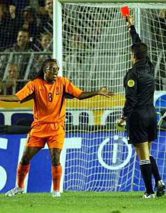 Полузащитник туринского "Ювентуса" и сборной Голландии Эдгар Давидс уже к 14-й минуте успел получить две желтые карточки и покинул поле, к тому же еще и сбив в собственной штрафной Карела Поборски. |