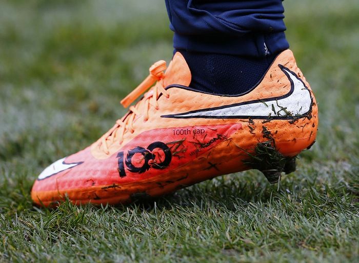 Нападающий сборной Англии Уэйн Руни, для которого сегодняшний отборочный матч Euro-2016 со Словенией стал 100-м в составе национальной команды, отметил это событие специальной экипировкой. На бутсы форварда "МЮ" нанесены цифры 100 и надпись "100-й матч за сборную".