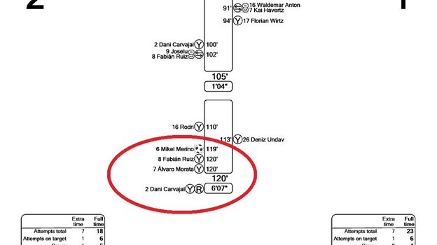 Из этого следовало, что капитан испанцев заработал второе предупреждение на турнире и вместе с защитниками Дани Карвахалем и Робином Ле Норманом пропустит полуфинал из-за дисквалификации. Они с Даниэлем Вивианом «висели» на карточке.