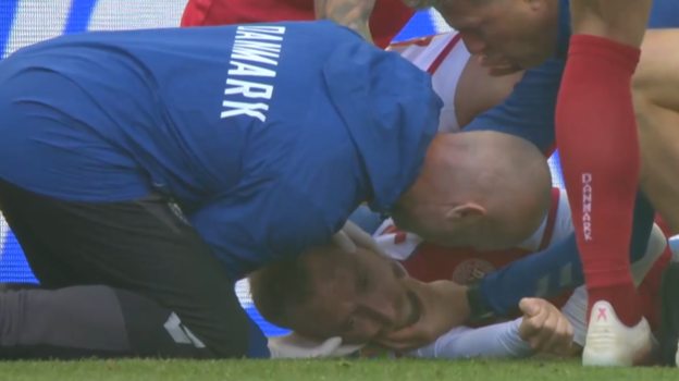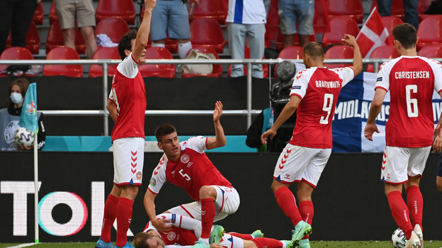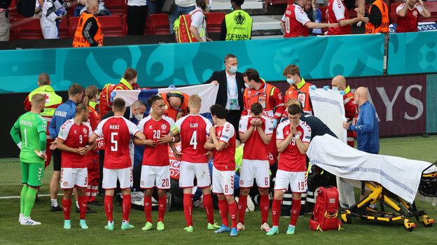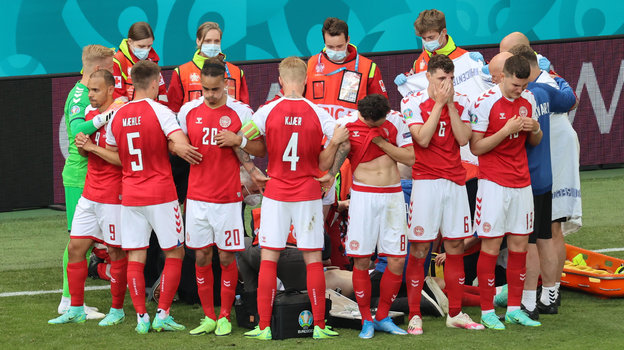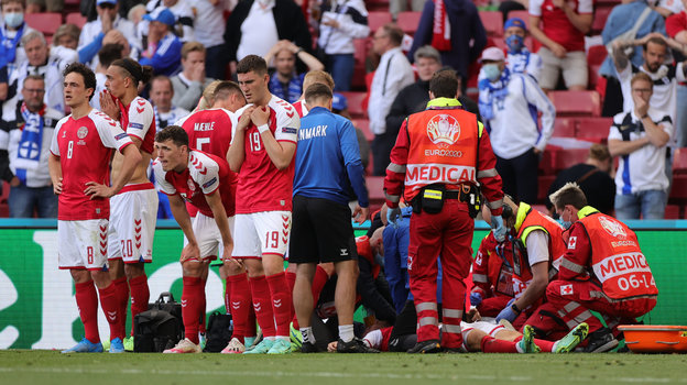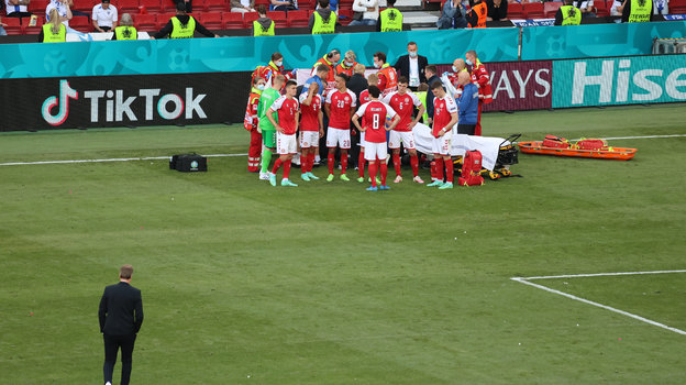 По ходу первого тайма матча Евро-2020 между Данией и Финляндией в Копенгагене полузащитник датчан Кристиан Эриксен потерял сознание и упал на поле около одной из трибун. Эриксен завалился без контакта с соперниками при движении за мячом.