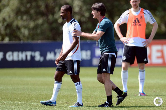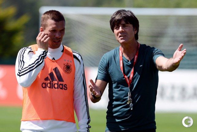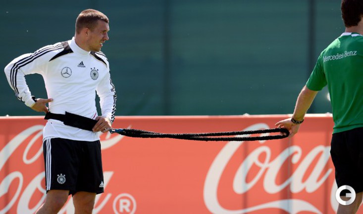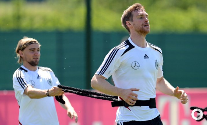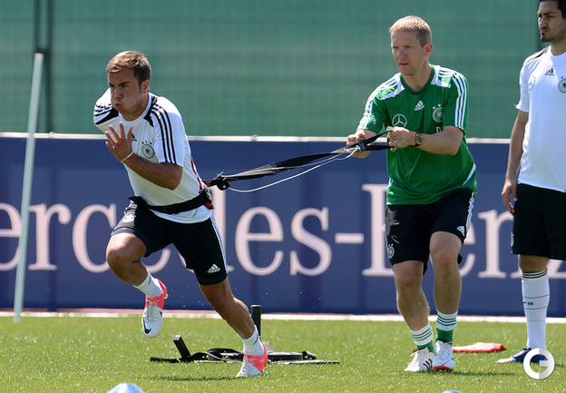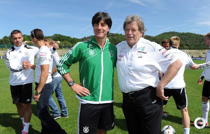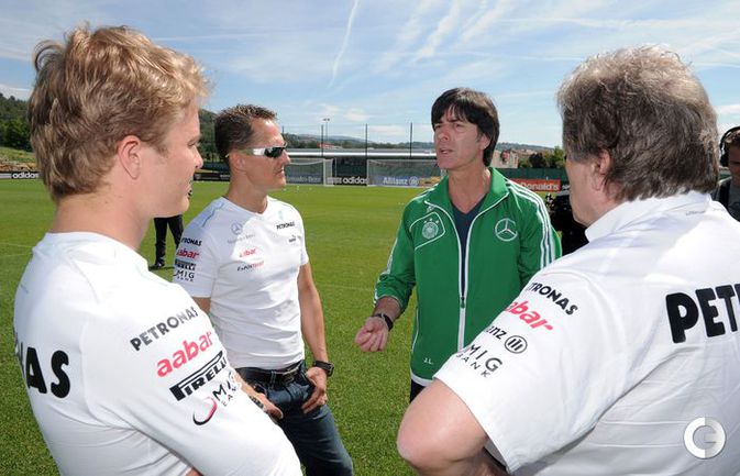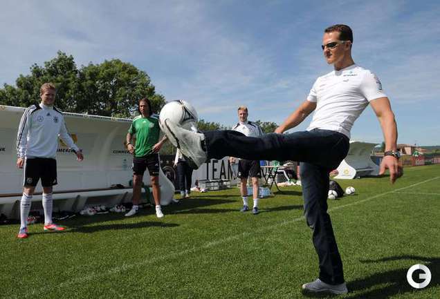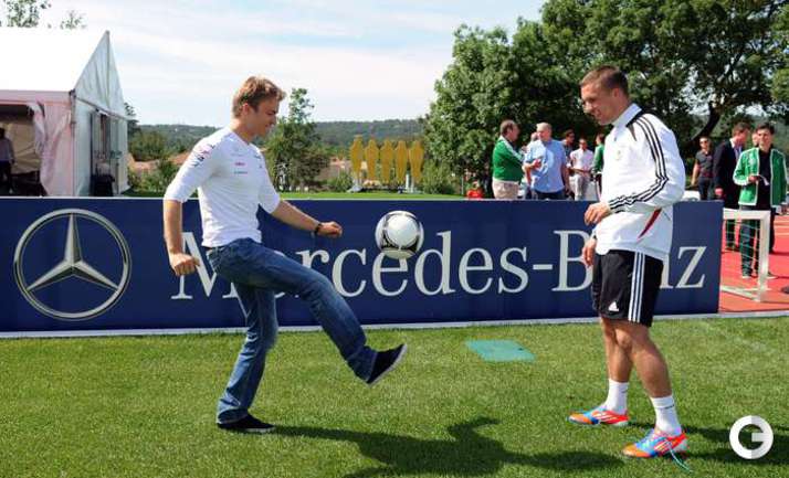 Футбол. Автогонщики "Формулы-1" Михаэль Шумахер и Нико Росберг посетили тренировку сборной Германии, которая проводит подготовку к ЕВРО-2012 в окрестностях французской Ниццы. Фото AFP