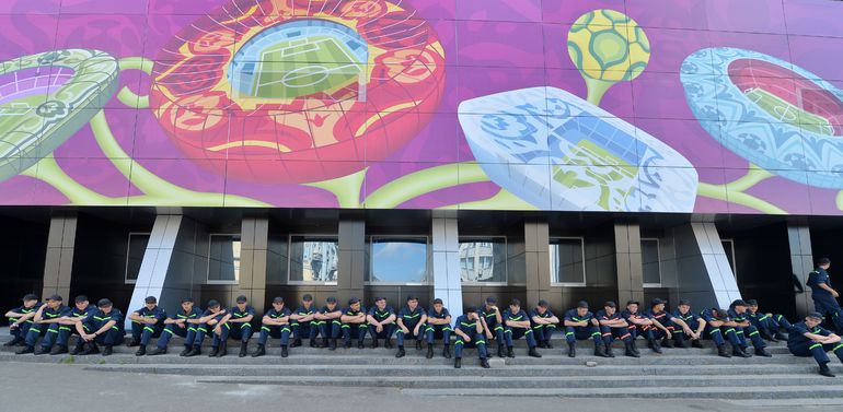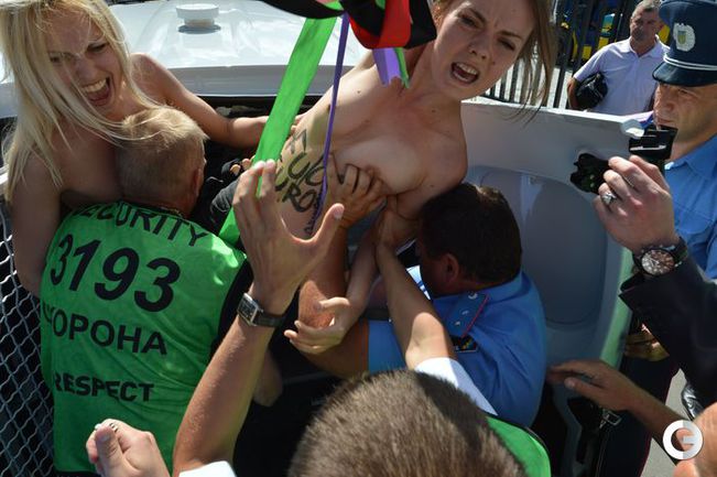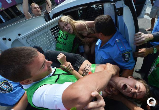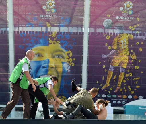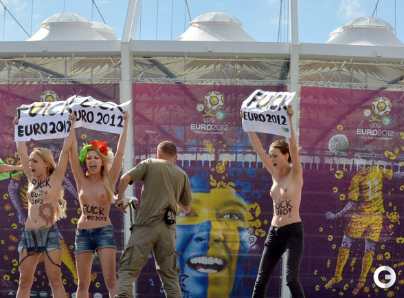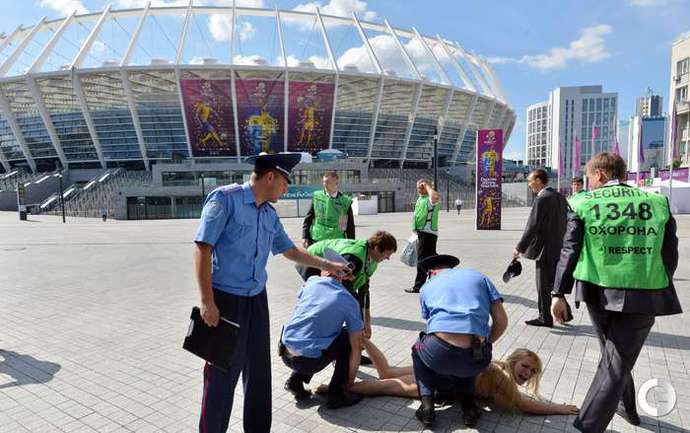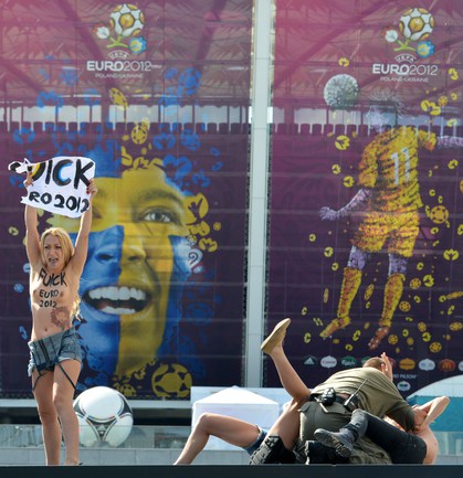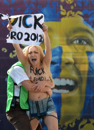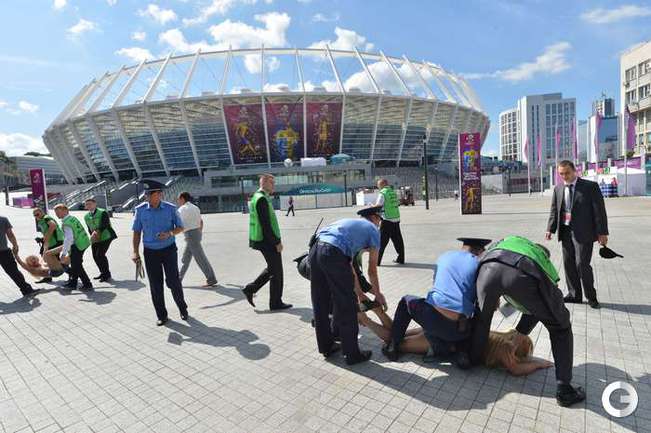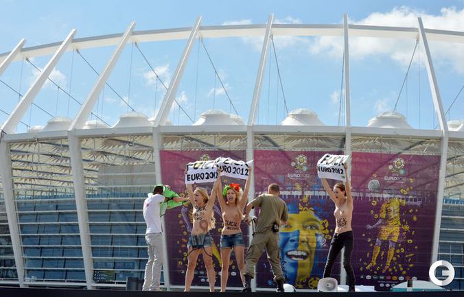 EURO-2012. Украинские активистки общественного движения FEMEN устроили акцию протеста у НСК "Олимпийский". FEMEN обвиняет УЕФА в том, что посредством проведения EURO федерация футбола оболванивает население, спаивает и пропагандирует проституцию. Фото AFP