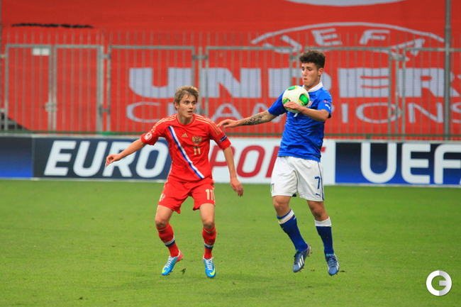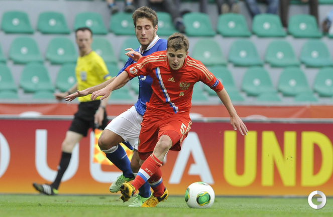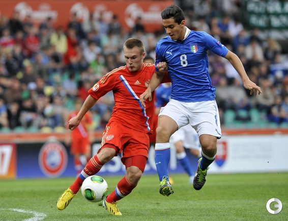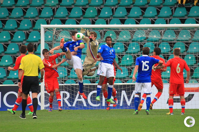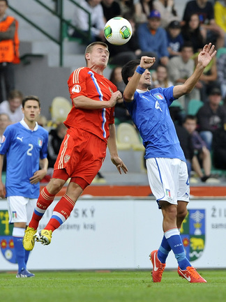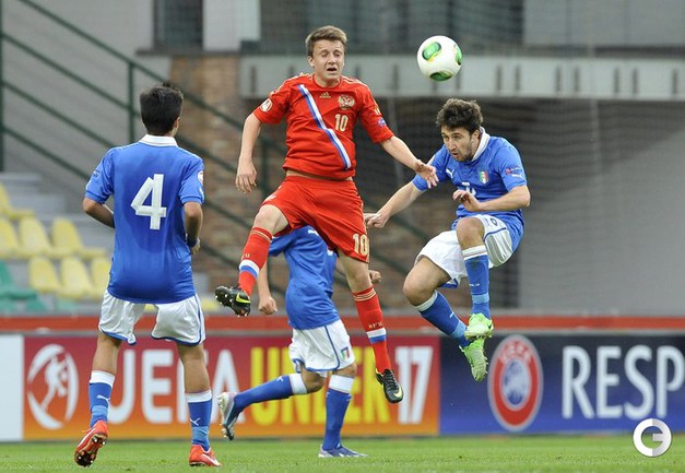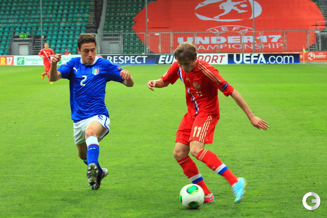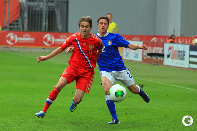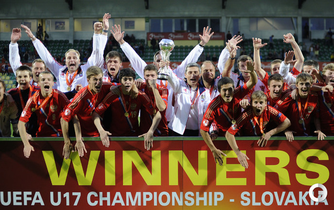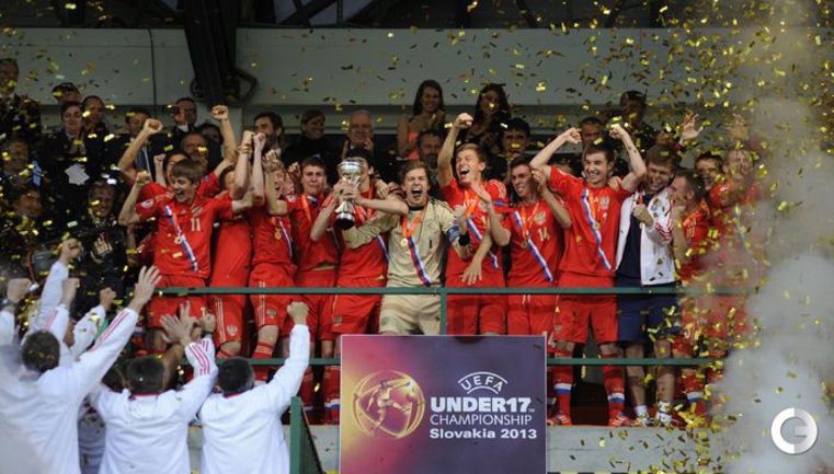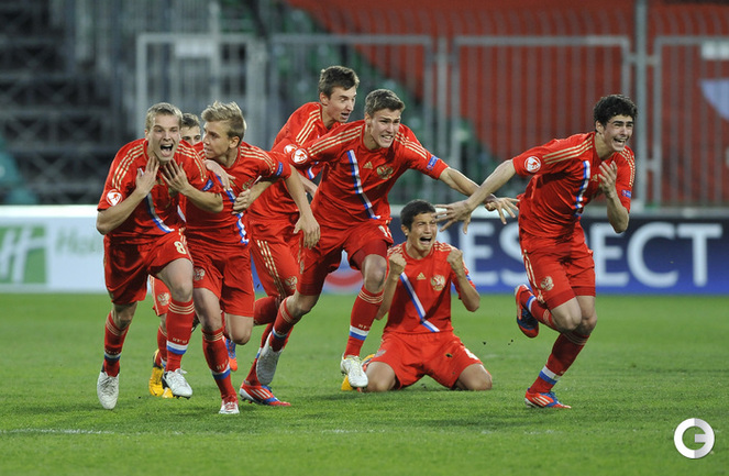 Футбол. Жилина. Футбол. Чемпионат Европы. Юношеские сборные (игроки не старше 17 лет). Финал. Италия – РОССИЯ – 0:0. Пенальти – 4:5. Юношеская сборная России в финале чемпионата Европы (игроки 1996 г.р.) победила Италию. Подопечные Дмитрия Хомухи, как и в полуфинале со Швецией, взяли верх в серии пенальти. Таким образом, россиянам удалось повторить результат 2006 года, когда на континентальном первенстве золото выиграла команда Игоря Колыванова – и тоже в серии пенальти. Фото AFP и Дмитрий Артюшкин