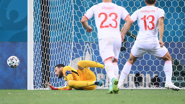 В первом тайме швейцарцы забили первыми, а после перерыва у них был шанс удовить преимущество, но Юго Ллорис отразил пенальти.