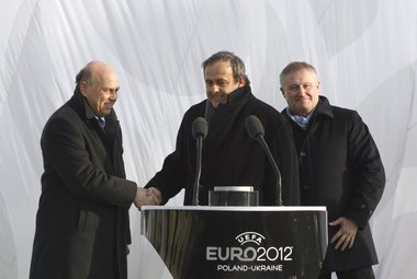 После церемонии Платини, Суркис и Лято рассказали журналистам о дальнейших этапах подготовки двух стран к чемпионату Европы. Так, глава Федерации футбола Украины среди четырех городов, получивших право принять матчи турнира, особо выделил Харьков. По словам Суркиса, владельцу клуба "Металлист" Александру Ярославскому удалось идеально синхронизировать усилия власти и бизнеса, а подконтрольные ему структуры уже инвестировали в подготовку Харькова более 600 миллионов долларов. В итоге город, первоначально считавшийся резервным, не только ворвался в число основных, но и признан избравшим образцовую модель развития инфраструктуры.