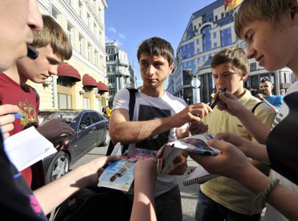 Глушаков прибыл к отелю на белом "Порше" и в белой майке с изображением не слишком одетой девушки, совсем не похожей на провожавшую его супругу. На микроавтобусе появилась четверка игроков из Питера. Компанию Малафееву, Анюкову и Денисову составил Аршавин. Именно на него и набросились любители автографов и фото на память. Как только из-за одной из камер раздался затравочный вопрос "Как настроение?" - капитан сказал "Спасибо!" и удалился. Тему футболок с картинками продолжил Дзагоев. Он прикатил на белом "Мерседесе" и в белой майке с изображение Микки Рурка. Воспитываемый клубом армеец в сторону камер и фотоаппаратов бросил взгляд - и молча скрылся.