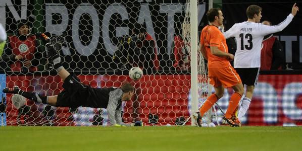 "Оранжевые" начали в Гамбурге неплохо, однако свои претензии на доминирование ничем не подкрепили. Отметился опасным прострелом игравший в маске Хюнтелар, позже неплохо приложился с дистанции и едва не попал в "девятку" Снайдер. Вот и все. Тот же Снайдер больше запомнился фолом в центре поля против Клозе. Капитан бундестим, имевший проблемы со здоровьем, поучаствовал в первом остром моменте вечера. После скидки Мюллера справа он сместился к штрафной и в борьбе пробил рядом с ближним углом. В итоге сработала обратная связка. Как раз после выстрела Снайдера.