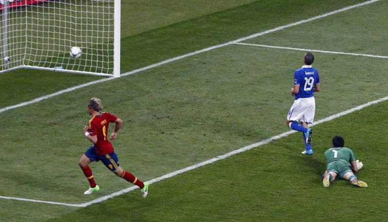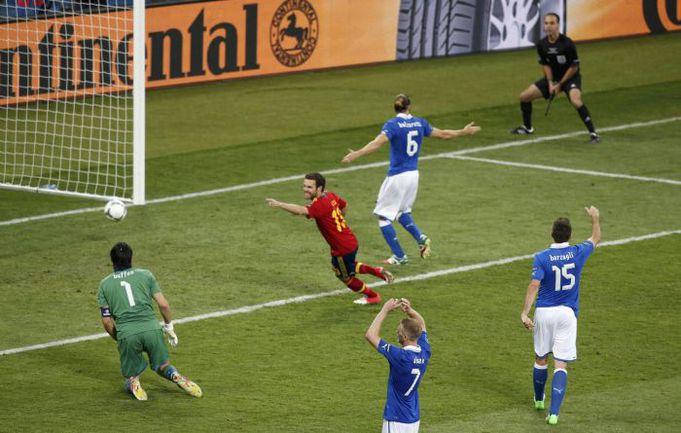 Не заставивший себя ждать гол пришел от Касильяса, с 14 передачами и восемью участниками атаки. Хаби Алонсо сместил ее слева-направо на Арбелоа, Хави переключил скорость в центре. Концовка - пас Иньесты в коридор между тремя соперниками, рывок Фабрегаса от Кьеллини к линии ворот с подачей назад и удар головой Сильвы из окружения Бонуччи и Барцальи в левую "девятку".