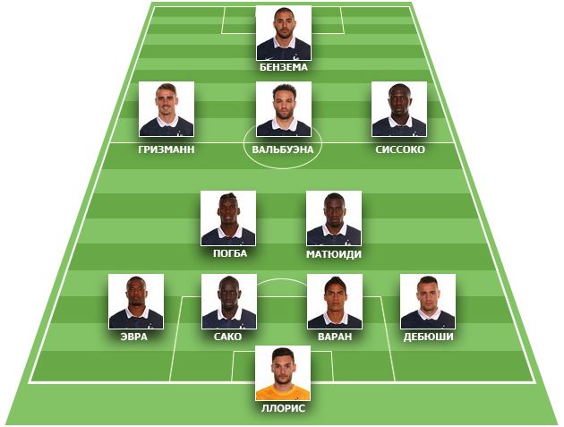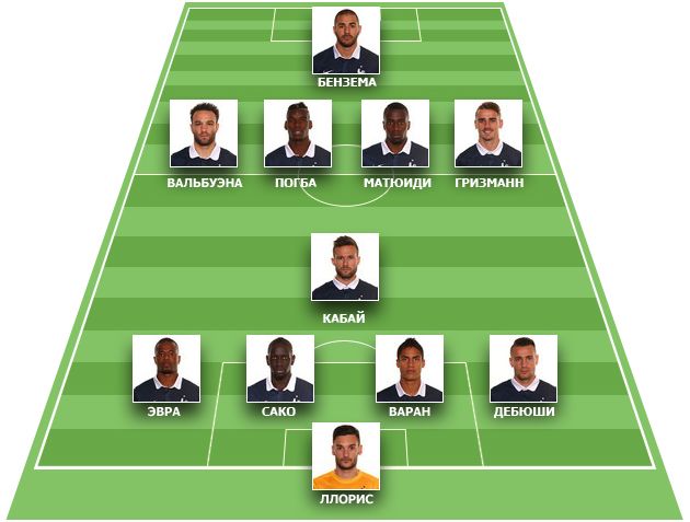 Эта игра примечательна тем, что Дешам отошел от схемы 4-3-3, которую сборная использовала на ЧМ-2014, применив расстановку 4-2-3-1. Впрочем, команда часто использовала ее в недалеком прошлом до тех пор, пока не потерпела неудачу в Киеве (0:2) в первом стыковом отборочном матче.