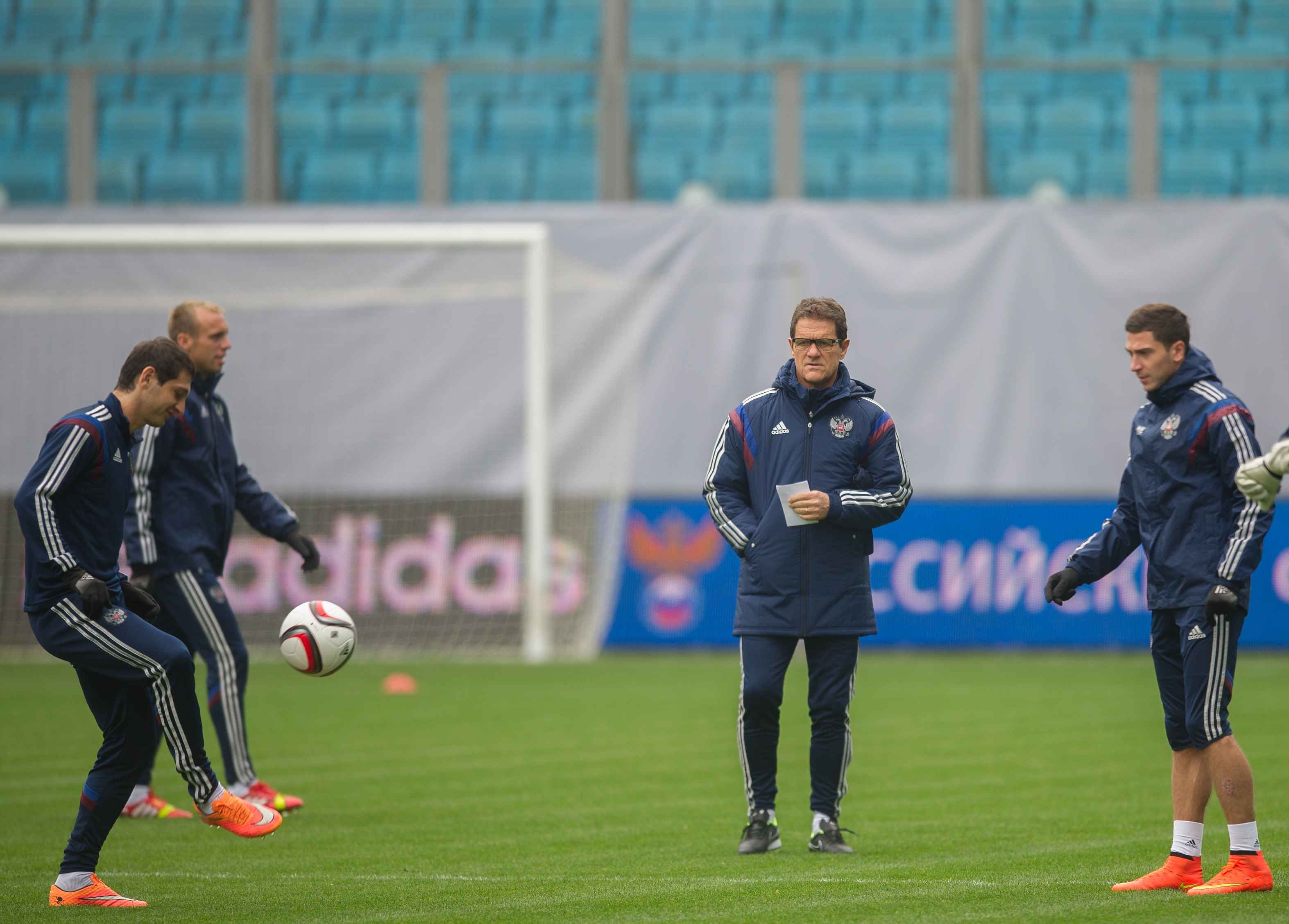 Вчера. Химки. Тренировка сборной России. Алан ДЗАГОЕВ, Денис ГЛУШАКОВ, Фабио КАПЕЛЛО и Алексей ИОНОВ (слева направо). Фото - Антон СЕРГИЕНКО, "СЭ"