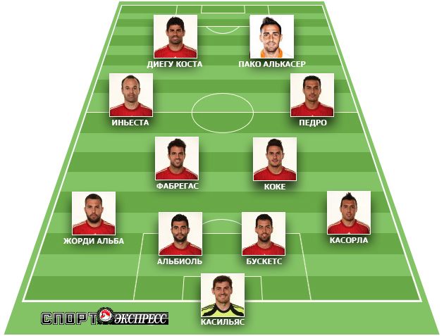 Минуту спустя последовал ответ от испанского легиона "Челси": навес Фабрегаса завершал ударом головой Диегу Коста, но чуть промахнулся. Испано-бразильский форвард забил более половины своих голов этого сезона с пасов Сеска, но в составе сборной эта связка в дальнейшем толком не работала. Коста, по-прежнему сохраняющий отнюдь не гордый ноль в графе забитых мячей за сборную, выглядел оторванным от команды. Сборная Испании комбинировала - Коста оставался в стороне. С уходом из команды Хави и Хаби Алонсо стиль игры испанцев несколько поменялся – чуть возрос риск в передачах, ставших более вертикальными, скорость игры несколько увеличилась, но вот привычная проблема центрфорварда по-прежнему не решена. В прошлой игре на острие отлично смотрелся Пако Алькасер, а вот Диегу Косте вписаться в командную игру не удавалось.