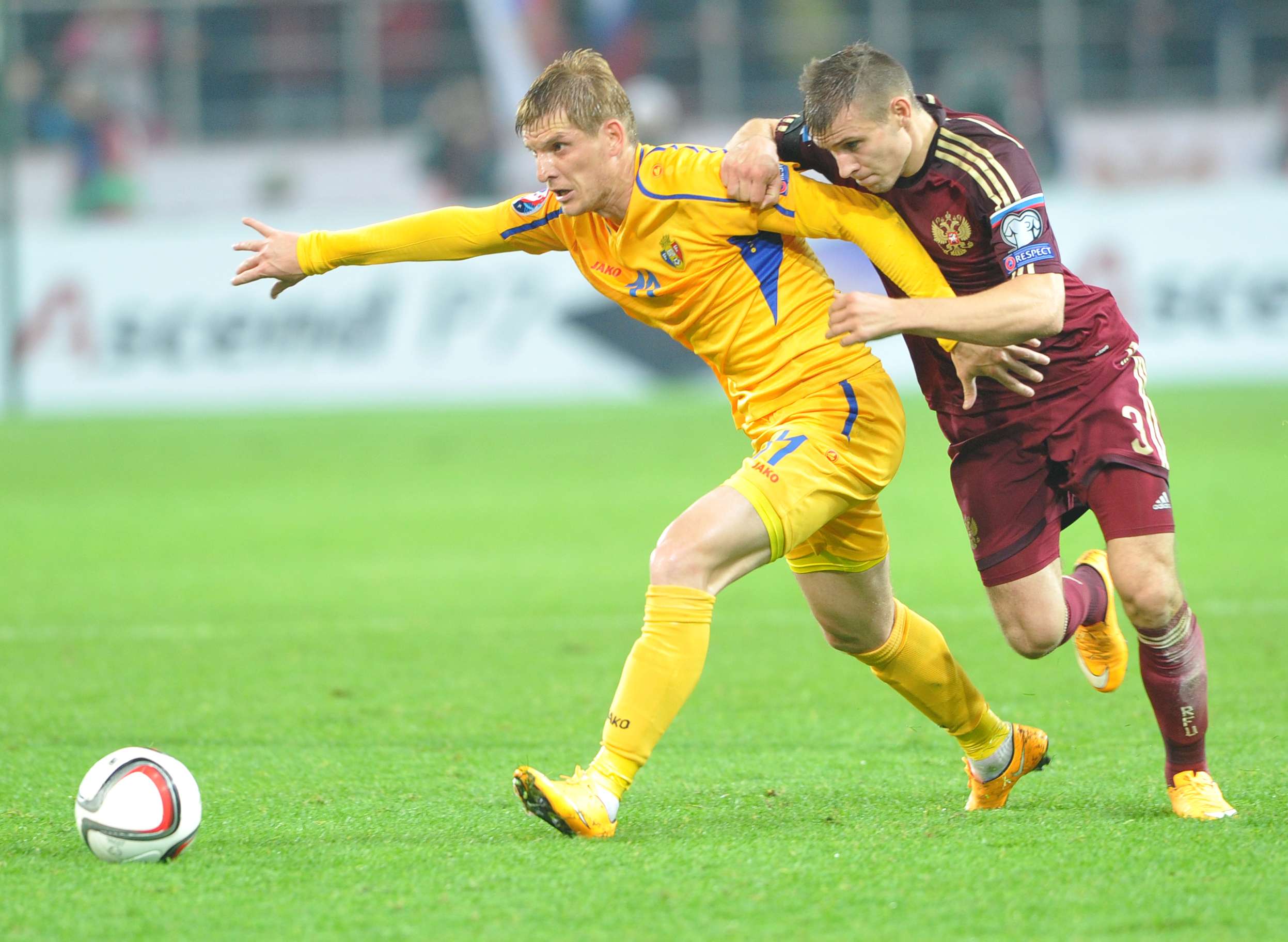 12 октября 2014. Москва. Стадион "Открытие Арена". Россия – Молдавия – 1:1. Сергей ПАРШИВЛЮК пытается остановить Игоря ПИКУЩАКА. Фото - Татьяна Дорогутина, "СЭ"