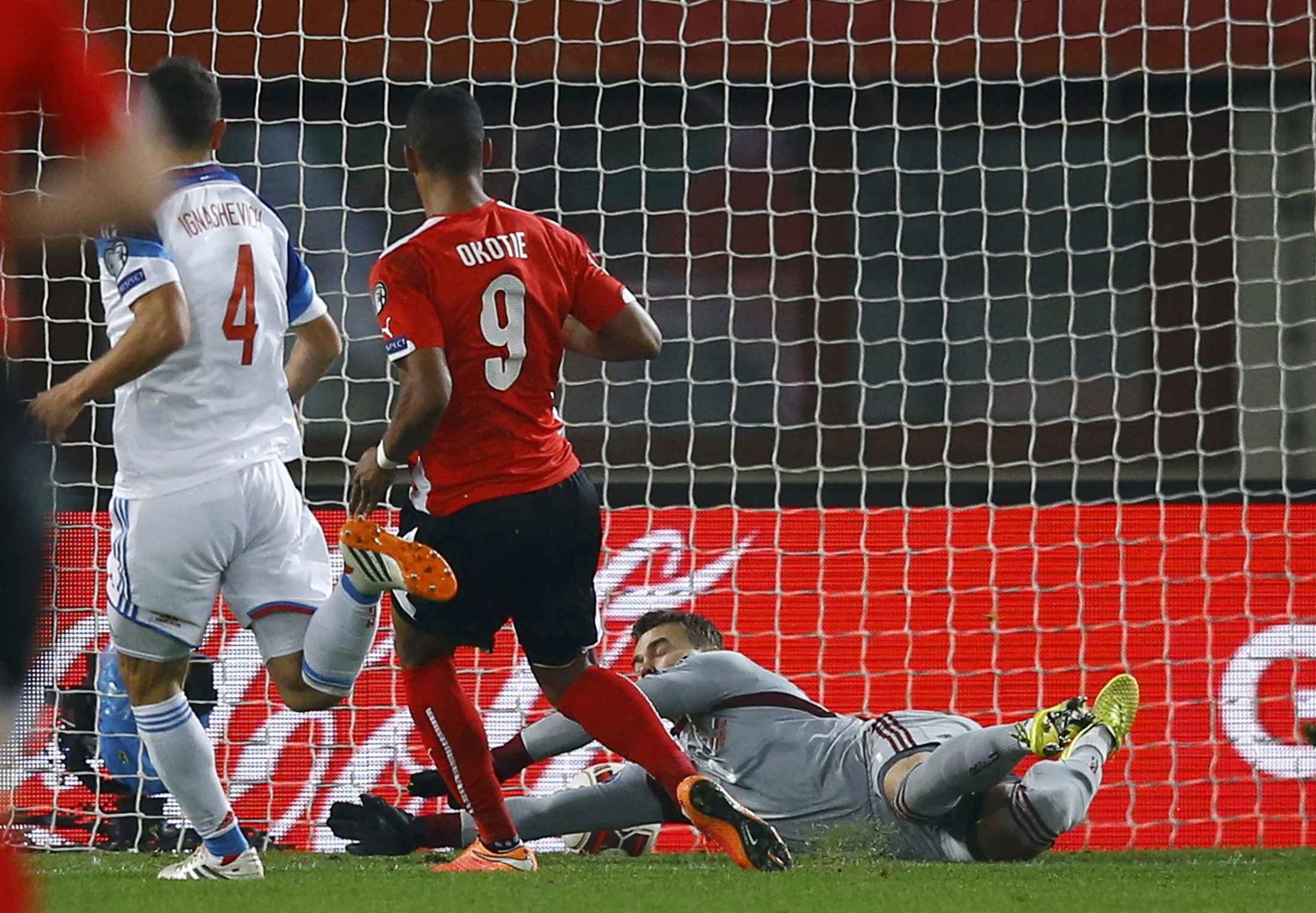 Суббота. Вена. Австрия – Россия – 1:0. Форвард сборной Австрии Рубин ОКОТИ забивает гол в врота Игоря АКИНФЕЕВА. Фото REUTERS