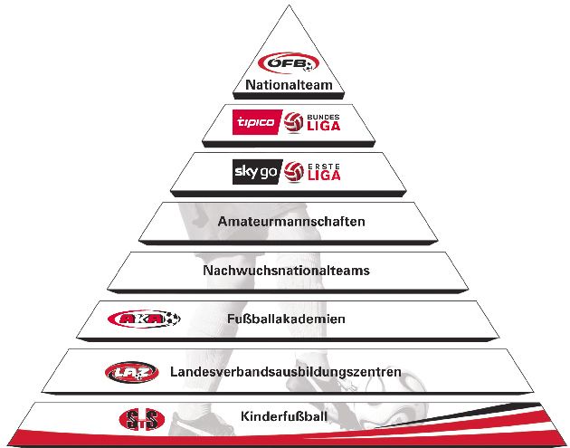 Все начинается с пирамиды – схематичного и понятного изображения структуры австрийского футбола – от детского до первой сборной и клубов первой лиги.