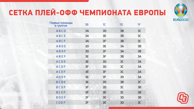 Напомним, что в 1/8 финала выходит 16 из 24 команд — к двум первым из каждого квартета добавляются четыре лучшие из числа занявших третьи места. Первый раунд плей-офф по регламенту выглядит так: