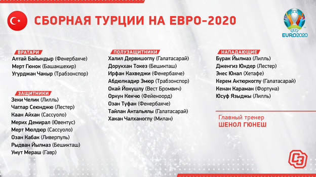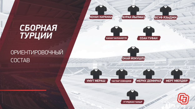 В центре обороны турецкой сборной — связка Чаглара Сеюнджу из «Лестера» и Мериха Демирала из «Ювентуса», в центре поля изобретательный Хакан Чалханоглу, а в центре нападения один из главных героев минувшего чемпионата Франции Бурак Йылмаз. Оптимальный состав сборной Турции впечатляет по именам.