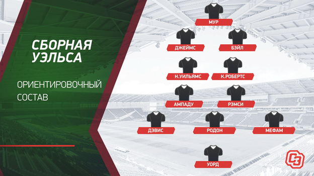 Два человека из «Тоттенхэма» — Бен Дэвис и Джо Родон — отвечают за надежность в защите, Рэмси — главный мозг в центре поля, играющий рядом с ним Ампаду работает на оборону, быстрые Дэн Джеймс и Бэйл стараются что-то придумать в атаке. Перед стартом турнира оптимальное сочетание игроков сборной Уэльса выглядит так.