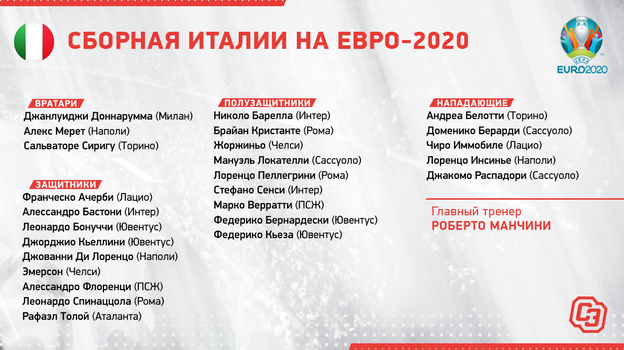 Говорят, что в этом поколении итальянцев нет больших звезд, но яркие игроки есть в каждой линии. Доннарумма в воротах, легендарная пара из «Ювентуса» — Кьеллини и Бонуччи — в центре обороны, победитель Лиги чемпионов Жоржиньо, компанию которому составляют Верратти и, возможно, лучший полузащитник серии А Барелла, новый лидер «Юве» — Кьеза — в атаке. Оптимальный состав сборной Италии смотрится весьма внушительно.