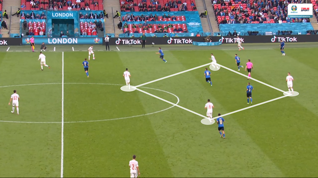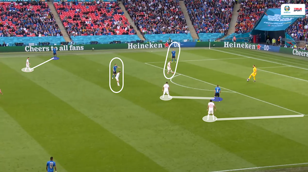 В свою очередь отвечающие за контроль мяча у Италии Жоржиньо и Верратти оказались не слишком полезны в сложившемся рисунке игры. Хавбек «ПСЖ» и вовсе провалил матч с точки зрения своих лучших качеств и был заменен на 73-й минуте. Верратти не отдал ни одной передачи с продвижением (в среднем 5 за матч на Евро) и ни разу не продвинул мяч на 5 метров ближе к чужим воротам (в среднем 8,8 таких действий за матч на Евро; не считаются продвижения с мячом на своих 40% поля).