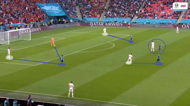 Итальянцы не привыкли к такому прессингу, а потому часто выбивали мяч вперед, где подбор оставался за испанцами — Иммобиле не выиграл ни одной верховой дуэли за матч. При попытке коротких розыгрышей Доннарумма практически всегда отдавал пас на Кьеллини — Бонуччи был под плотной опекой Ольмо. Этот ход объясняется тем, что Леонардо — обладатель одного из лучших первых пасов среди центральных защитников. Кьеллини в этом аспекте явно слабее. Итогом стала удручающая статистика первого тайма: каждое второе (51,4%) владение мячом итальянцев заканчивалось потерей из-за прессинга испанцев.