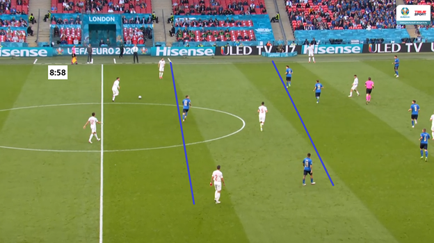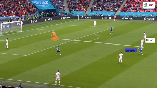 Наконец, в этом моменте открывание Ольмо в глубину помогло оставить за линией мяча пятерых игроков сборной Италии. Карта касаний футболиста в первые 45 минут показывает, как часто он беспрепятственно использовал один и тот же прием.
