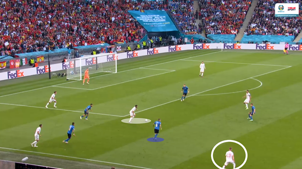 Во втором тайме Италия начала встречать соперников еще ниже. Инсинье отрабатывал меньше по сравнению с другими, но именно его высокая позиция помогла в голевой атаке. Правда, непонятно, почему Гарсия готовился закрывать левую ногу Кьезы, хотя тот — ярко выраженный правша...