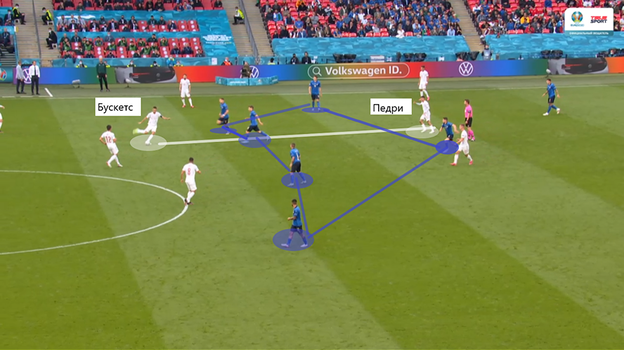 Такое снижение агрессии и интенсивности в давлении не могло не повлечь дополнительной свободы на мяче. Педри находил пространство вне опеки Бареллы и отлично обострял. 18-летний полузащитник «Барсы» — по статистике один из лучших креативных футболистов турнира (по продвигающим передачам и пасам в штрафную площадь он уступает лишь Тони Кроосу). В первом тайме он и вовсе выбил гроссмейстерские 100% точности передач (31 из 31), а за весь матч ошибся лишь дважды (65 из 67, из них 2 передачи под удар, 4 — с продвижением мяча).