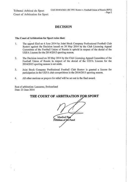 1. Апелляция "Ростова", поданная 6 июня 2014 года на решение апелляционного комитета РФС о невыдаче лицензии УЕФА от 30 мая 2014 года, удовлетворена.