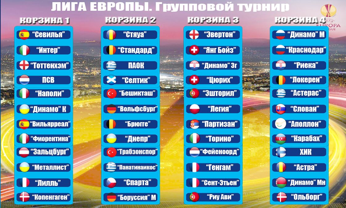 Корзина 1: "Севилья" (Испания) – 71,042. "Интер" (Италия) – 95,387. "Тоттенхэм" (Англия) – 75,949. ПСВ (Голландия) – 64,862. "Наполи" (Италия) – 61,387. "Динамо" К (Украина) – 56,193. "Вильярреал" (Испания) – 53,542. "Фиорентина" (Италия) – 49,387. "Зальцбург" (Австрия) – 46,185. "Металлист" (Украина) – 45,693. "Лилль" (Франция) – 45,300. "Копенгаген" (Дания) – 45,260.