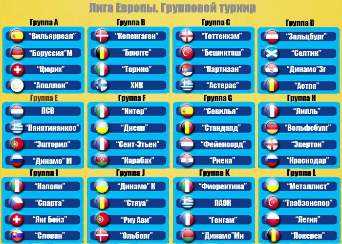 Группа G: "Севилья" (Испания), "Стандард" (Бельгия), "Фейеноорд" (Голландия), "Риека" (Хорватия).