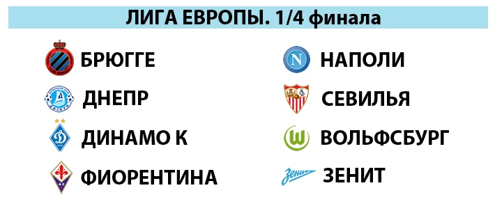 Определились все участники 1/4 финала Лиги Европы. На этой стадии турнира остался один представитель России - "Зенит". Вместе с ним в восьмерку лучших второго по значимости еврокубка вошли "Брюгге" (Бельгия), "Днепр", "Динамо" К (оба - Украина), "Фиорентина", "Наполи" (оба - Италия), "Севилья" (Испания), "Вольфсбург" (Германия).