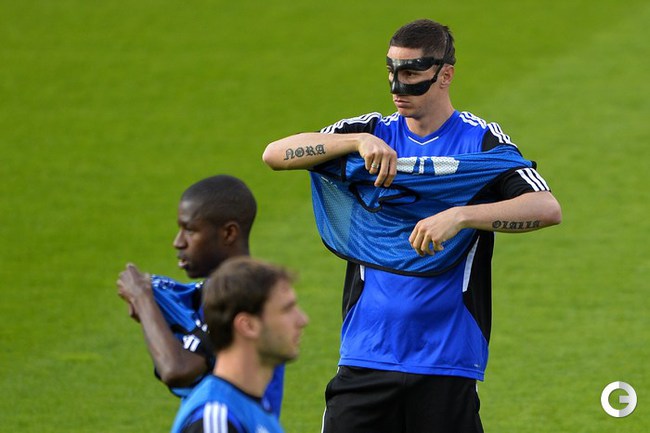 Фернандо Торрес в маске и без перед встречей "Челси" с "Базелем"