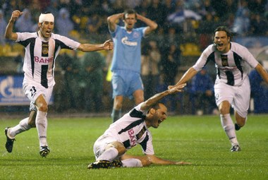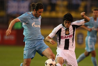 "Зенит" продолжал нагнетать давление, и на 34-й минуте усилия сине-бело-голубых воплотились в гол. Активный Текке переиграл оппонентов на "втором этаже" и от перекладины отправил мяч в ворота, несмотря на усилия Рафаэла Бракалли и Бруну Патакаша. Гол турка стал 100-м для питерцев в еврокубках, а небеса отреагировали на это усилившимся дождем.