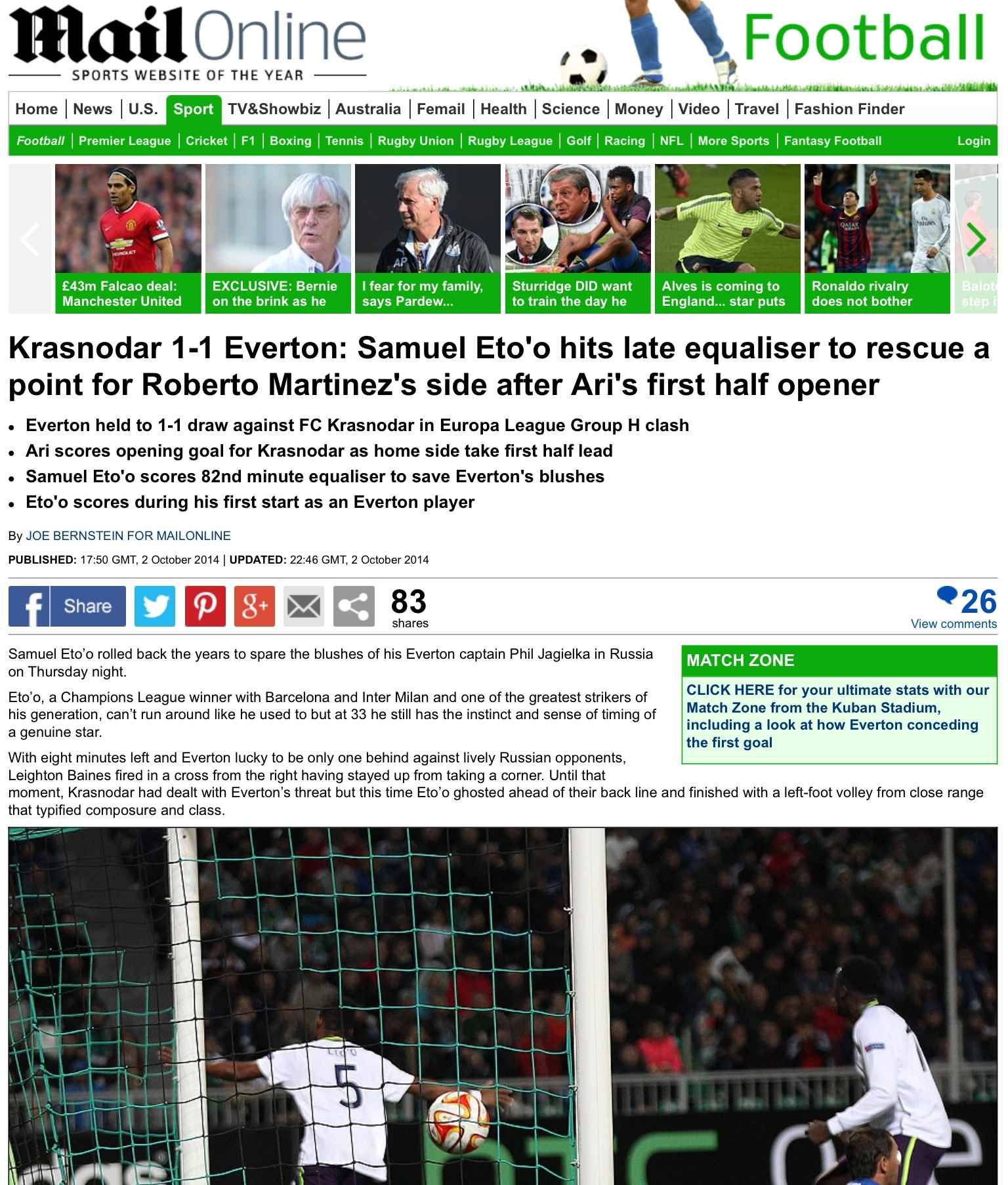 Daily Mail (Великобритания): "ИНСТИНКТ ЭТО'О ПОМОГ "ЭВЕРТОНУ" ДОБЫТЬ НИЧЬЮ