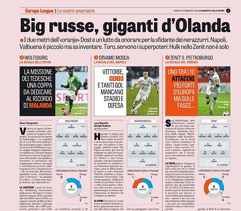 "Теоретически, легче всех должно быть "Наполи", – пишет La Gazzetta dello Sport. – Все-таки "Динамо" – это не "Зенит". Об этом говорит положение москвичей в турнирной таблице, их более скромный международный опыт и менее яркие имена игроков. Но опасаться здесь есть чего: бело-голубые дважды победили ПСВ и "Панатинаикос" и выбили из турнира "Андерлехт". В последних десяти матчах "Динамо" победило восемь раз и дважды сыграло вничью. В общем, внимание!"
