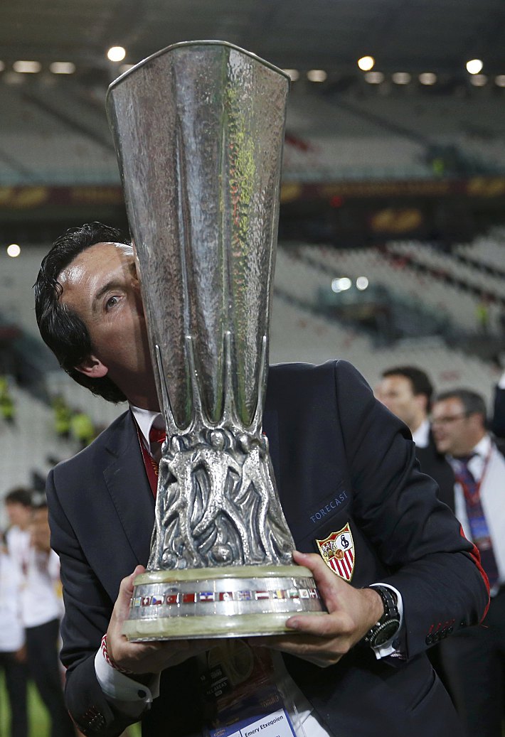 14 мая 2014 года. Турин. Лига Европы. Финал. "Севилья" - "Бенфика" - 0:0 (пенальти - 4:2). Унаи ЭМЕРИ с трофеем, который хочется у него отнять. Фото - REUTERS