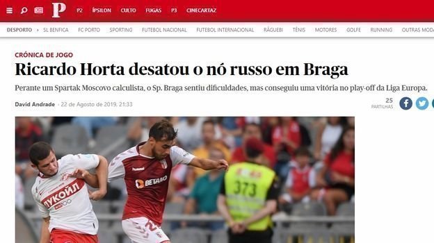 — Момент радости наступил на 74-й минуте, когда Уилсон сделал пас Эшгайю, тот прострелил, удар у Новаиша не получился, но мяч отскочил к Рикорду Орте. Ему было достаточно просто поднять ногу, чтобы попасть в цель. Гол был справедлив, во втором тайме «Брага» действовала агрессивно и быстро. Причем такой аспект, как скорость, оказался решающим, поскольку в действиях русских чувствовалась усталость — в понедельник у «Спартака» было дерби с ЦСКА. «Брага» вполне могла развить преимущество. Воины должны завершить свою миссию в России.