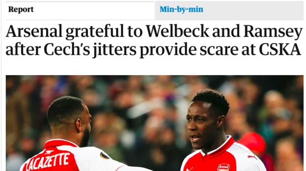 "Большую часть вечера "Арсенал" делал все, чтобы походить на "Барселону" в матче с "Ромой", – делает выводы The Guardian. – Такое поражение Арсен Венгер вряд ли бы пережил. "Арсенал" сыграл плохо, футболисты просто спали на поле большую часть матча. И ни разу не пробили в створ ворот ЦСКА в первом тайме. "Арсенал" был беззубым в атаке до тех пор, пока Уэлбек не забил свой мяч.