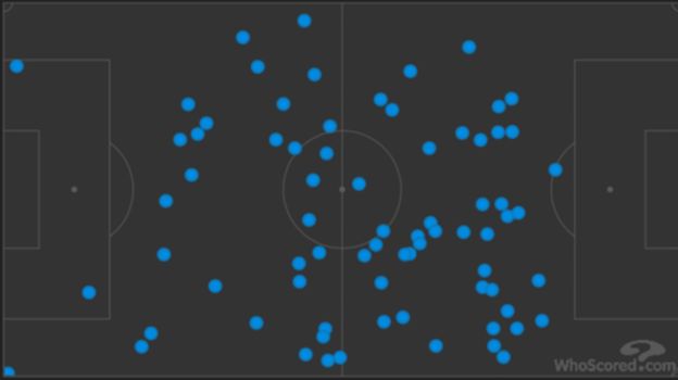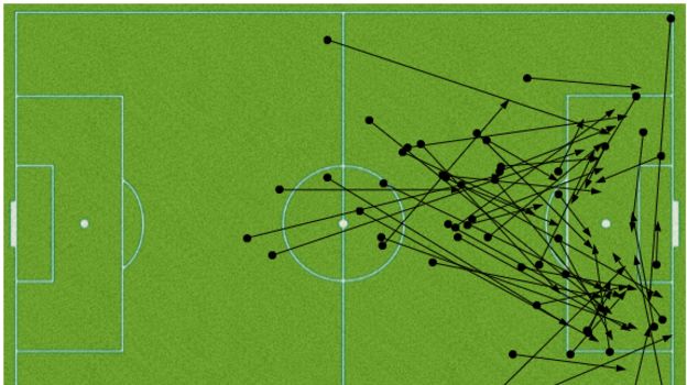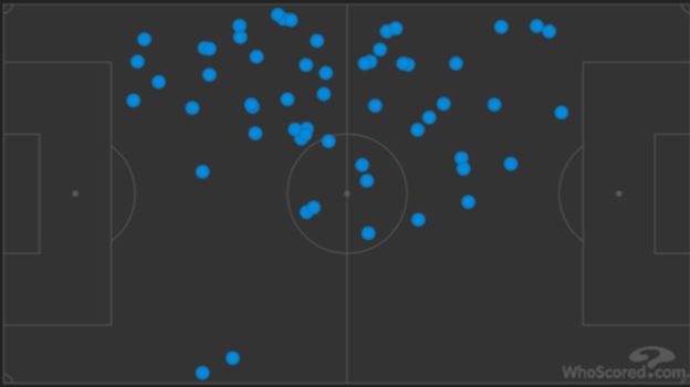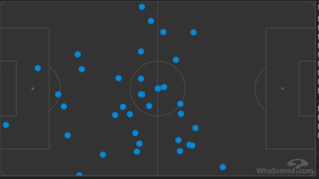 Кевин Фолланд уже освоил роль ложной девятки, которая постоянно в опускается за мячом и в одно-два касания включает фланги. Вот карта передач нападающего из того же матча с "Майнцем".