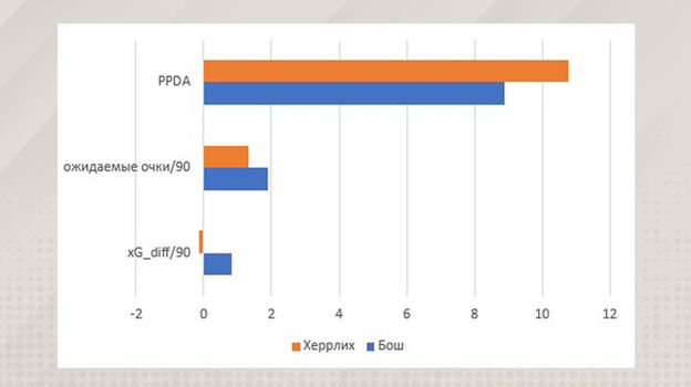 При Херрлихе показатели PPDA (passes per defensive actions – передачи подряд соперника без активного оборонительного действия как отбор, перехват или фол) были восьмыми в бундеслиге – 10,78 передач без подряд соперник делал без вмешательства. Сейчас этот показатель упал до 8,90 на дистанции трех туров, и "Байер" уже пятый в бундеслиге по этим показателям. Можно говорить про маленькую дистанцию, но был "выброс" против "Вольфсбурга", когда Бос банально не имел времени на подготовку команды (12,56 PPDA) и сложный во всех отношениях соперник ("Бавария"). Так что можно предполагать, что интенсивность прессинга только увеличится со временем.