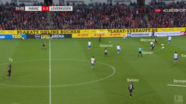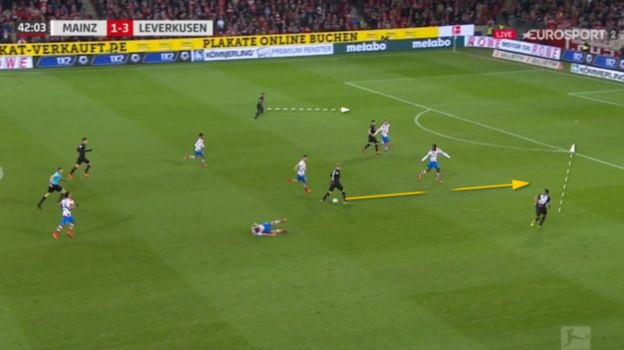 Только против "Майнца" "Байер" трижды отличился в фастбрейках, вылетая в контратаку сразу после отбора мяча втроем или вчетвером, сохраняя при этом ширину на флангах.