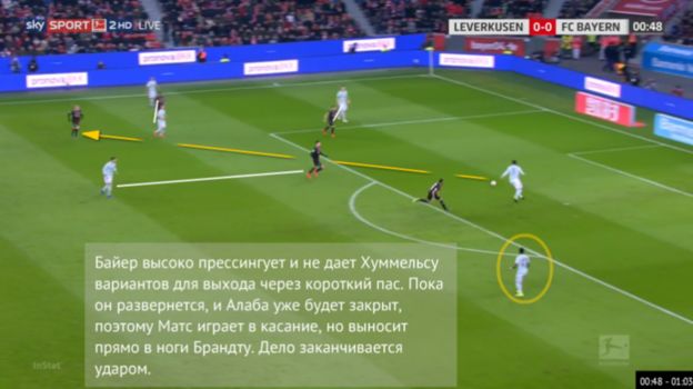 Если чуть подробнее, то "Байер" прессингует большим количеством игроков при розыгрыше мяча центральными защитниками и перекрывает варианты накоротке. Это особенно проблематично для команд, которые привыкли выходить через короткий-средний пас – либо придется играть лонгболлами, где хорошо борется за подбор Леверкузен, либо рисковать.