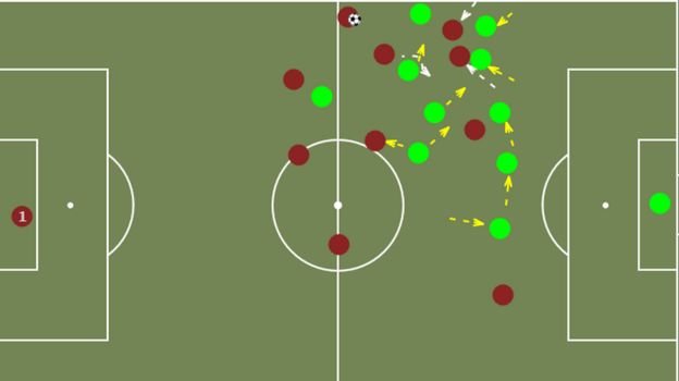 "Байер" готовит атаку через левый полуфланг. В центре остается один Арангис (опорник), а Венделл, Фолланд, Бэйли и Брандт комбинируют слева. Хаверц при этом идет на позицию Фолланда, чтобы а) создать ширину и развернуть атаку в изоляцию на Беллараби, б) открыться под кросс, когда "Байер" взломает правый фланг соперника. Фолланд делает несколько шагов в глубину и открывается под передачу. Атака заканчивается ударом Фолланда.
