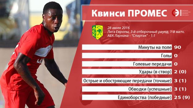 К оглушительному провалу, стоившему работы Дмитрию Аленичеву, Промес имеет самое прямое отношение. В ответной игре с киприотами он ни разу не смог переиграть в чужой штрафной защитников, сильно уступающих в классе, и вырваться на действительно опасную позицию. Из пяти его ударов только один пришелся в створ, да и тот был нанесен со штрафного. С подвижностью и дриблингом дела обстояли плохо, а в концовке матча Квинси попросту встал. Впрочем, как и вся команда.