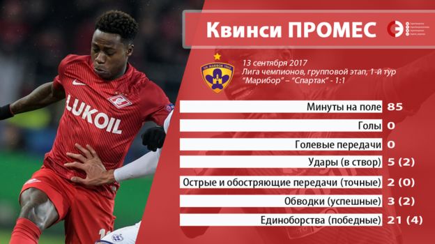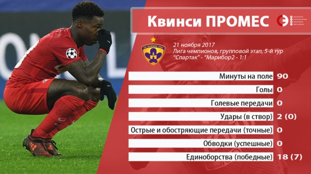 В Словении Промес провел один из самых слабых матчей за "Спартак". Голландец регулярно проигрывал единоборства, утыкался в защитников при попытке просочиться в штрафную, словно испугавшись дебюта в Лиге чемпионов, несмотря на скромный статус соперника. Весь "Спартак" в тот вечер провел очень слабую игру, но ряд футболистов – Марио Пашалич, Фернанду, Луиз Адриану, Александр Самедов – показали хотя бы что-то. А Промес запомнился разве что недовольством из-за ошибочной замены в концовке – Массимо Каррере показалось, что Квинси получил травму.