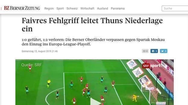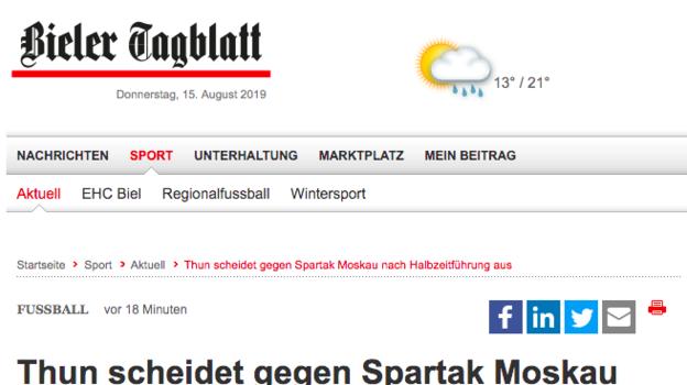 — «Тун» был уверен в своих силах, хорошо начал матч. Команда показала убедительную игру в первом тайме и была вознаграждена голом. «Тун» играл бесстрашно, как и хотел Марк Шнайдер. Почти всю первую половину гости контролировали ход матча. «Спартак» лишь раз подобрался к воротам Февра. Во втором тайме «Тун» несколько раз упускал возможность сделать счет 2:0. И до определенного момента лучшим игроком «Спартака» был вратарь Максименко, который раз за разом спасал команду. Впрочем, гости тоже заслужили высоких оценок за свое выступление. После 52-х минут Февр допустил роковую ошибку — не удержал мяч после удара Шюррле. Последовал гол, а спустя шесть минут второй. После сильного первого тайма ошибки посыпались одна за другой, а силы быстро покинули игроков «Туна». Поэтому вылет из Лиги Европы был неминуем.