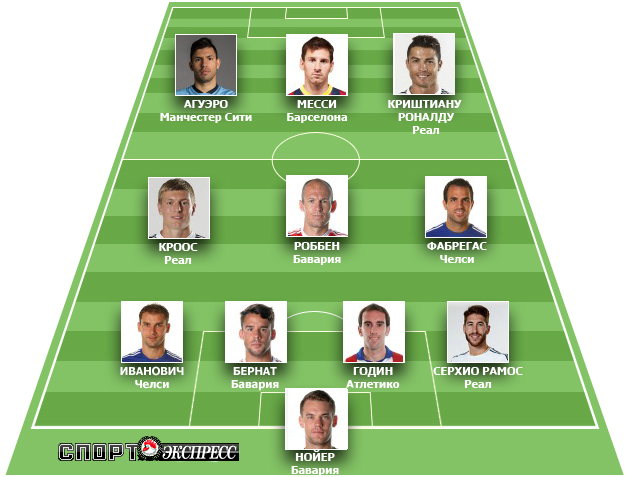 В сборную ноября вошли: Нойер ("Бавария", 5); Серхио Рамос ("Реал", 6), Годин ("Атлетико", 4), Бернат ("Бавария", 4), Иванович ("Челси", 3); Фабрегас ("Челси", 8), Роббен ("Бавария", 8), Кроос ("Реал", 6); Криштиану Роналду ("Реал", 13), Месси ("Барселона", 13), Агуэро ("Манчестер Сити", 11).